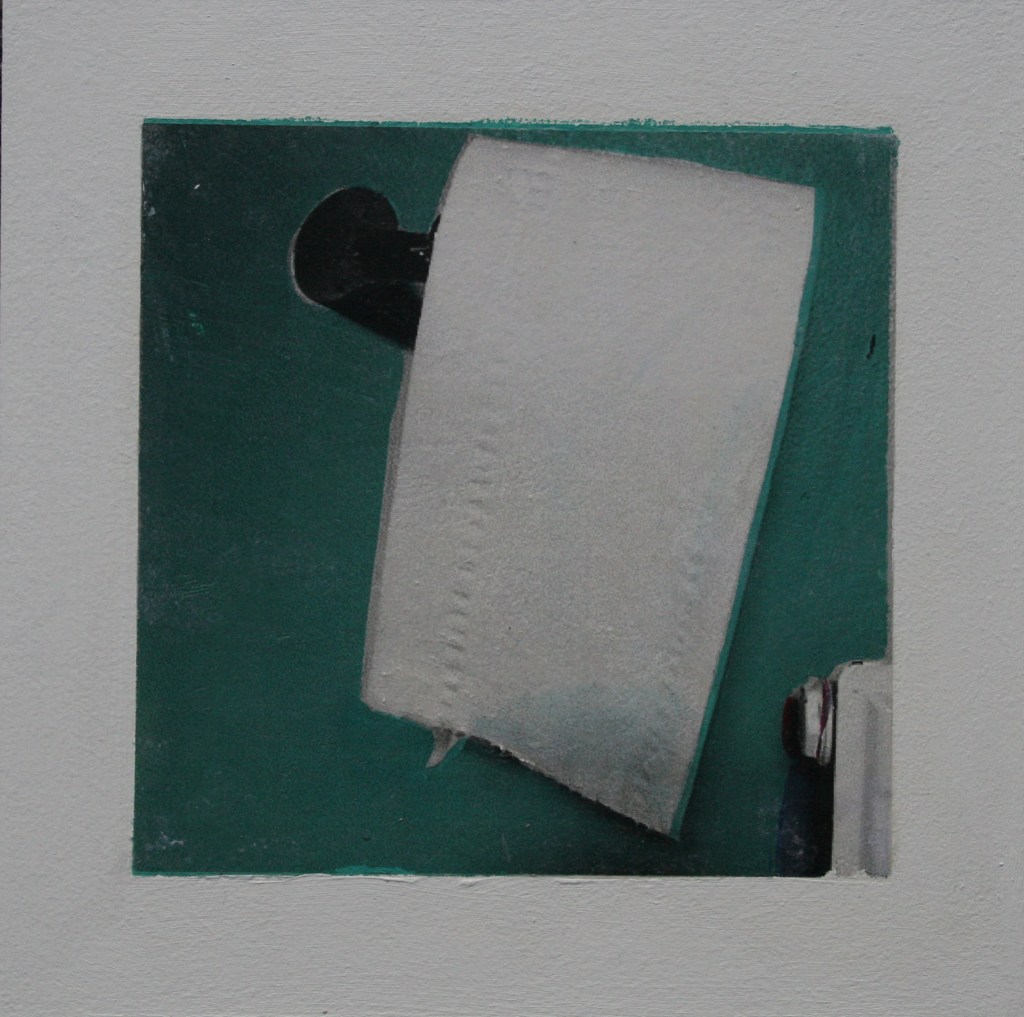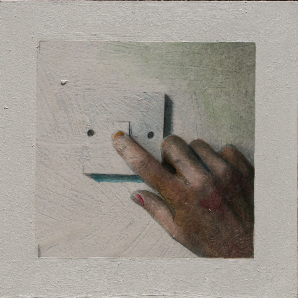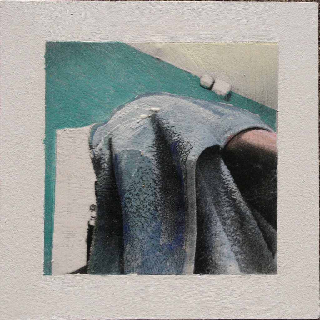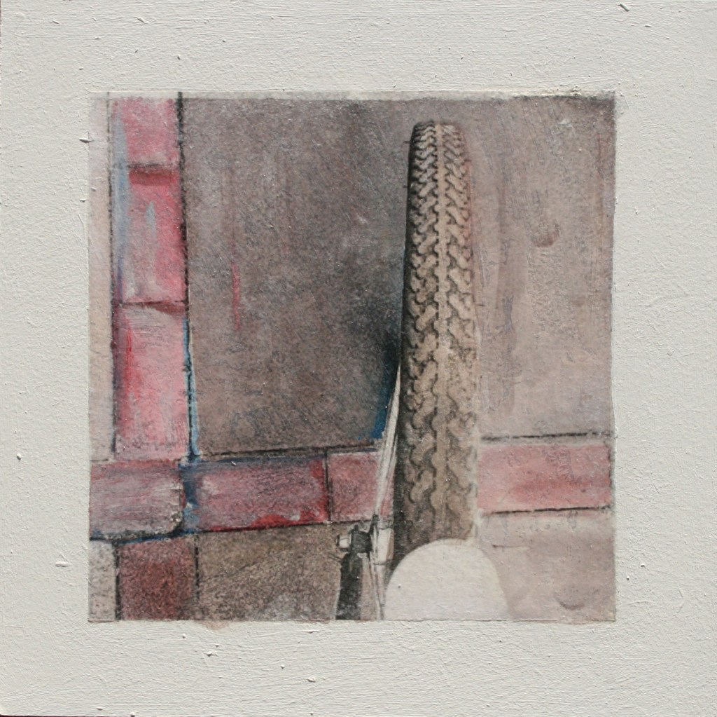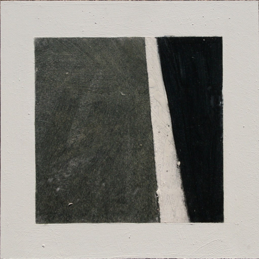 Acrylic and encaustic paint with pigment transfer on board 2016