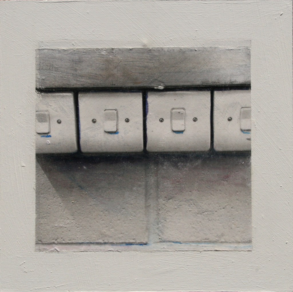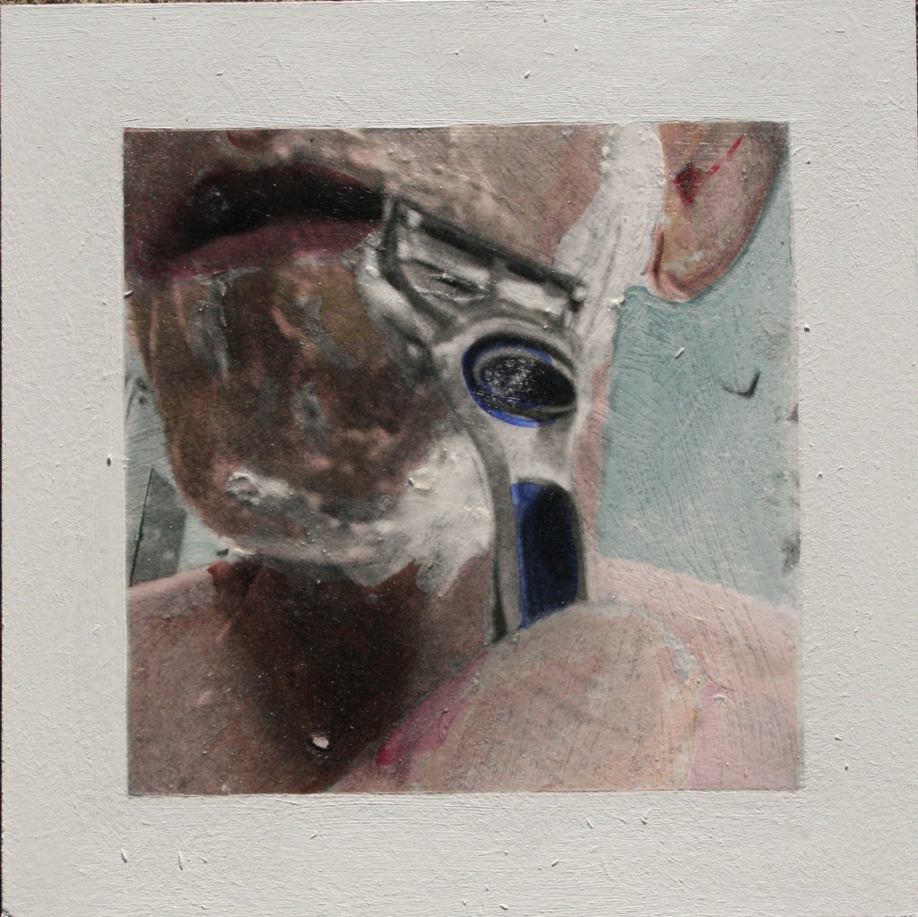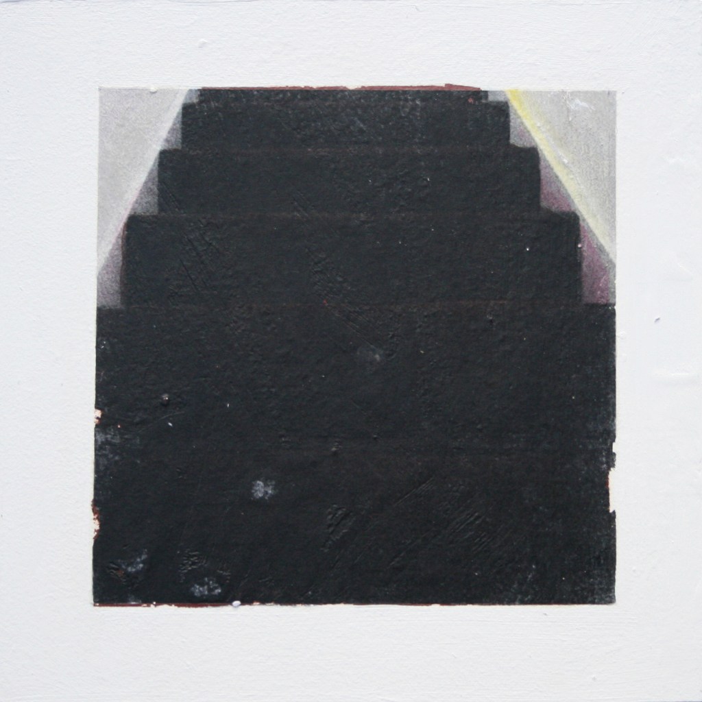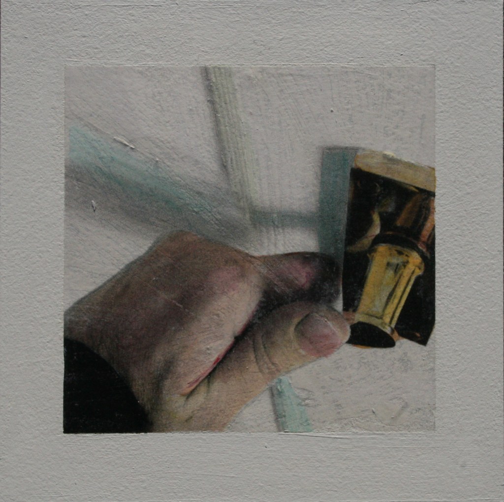 Acrylic and encaustic paint with pigment transfer on board 2016