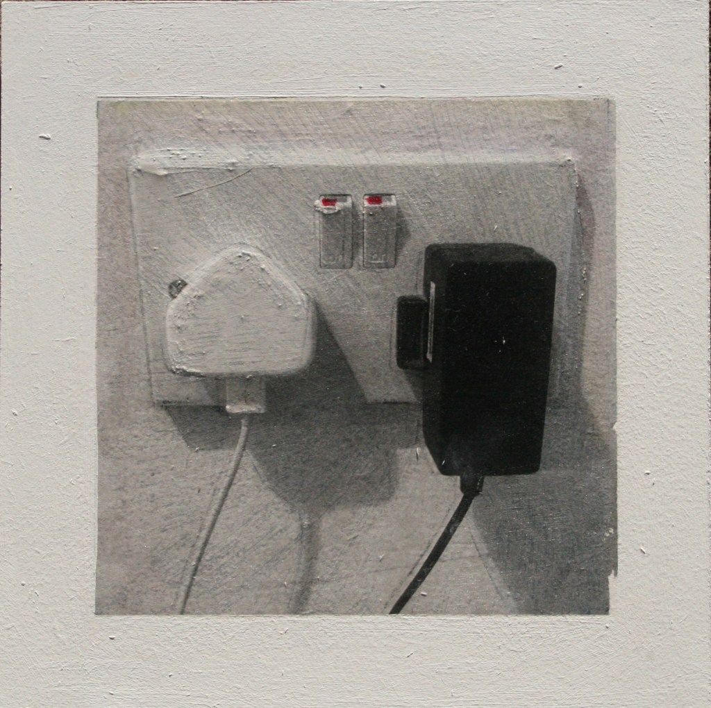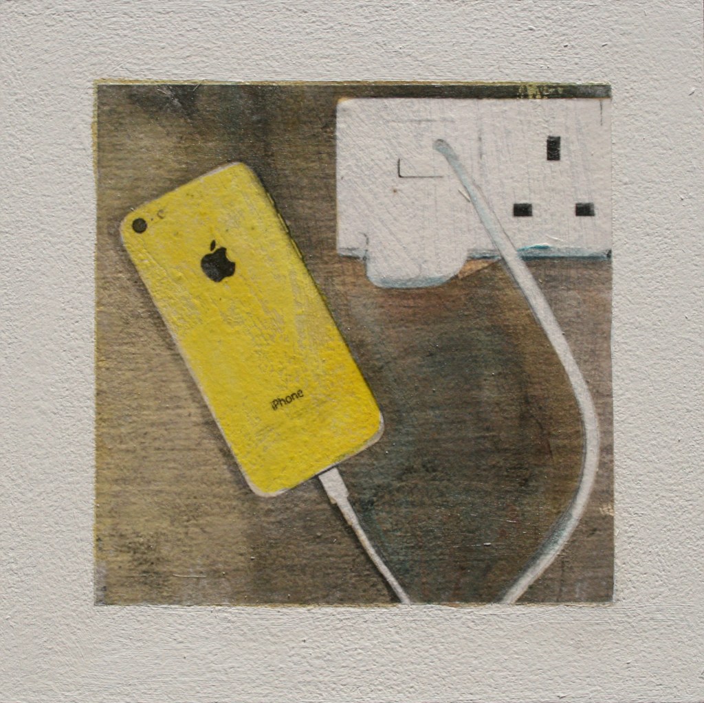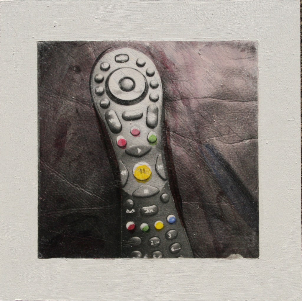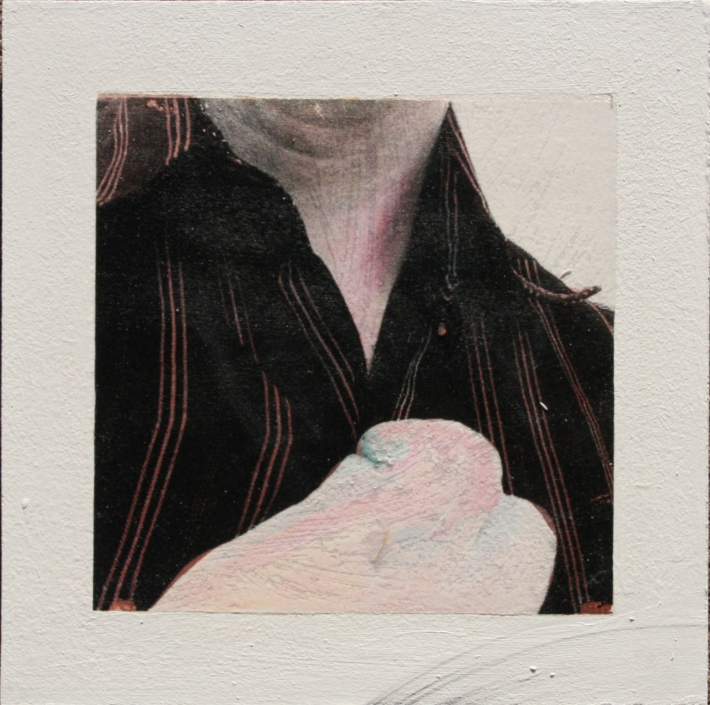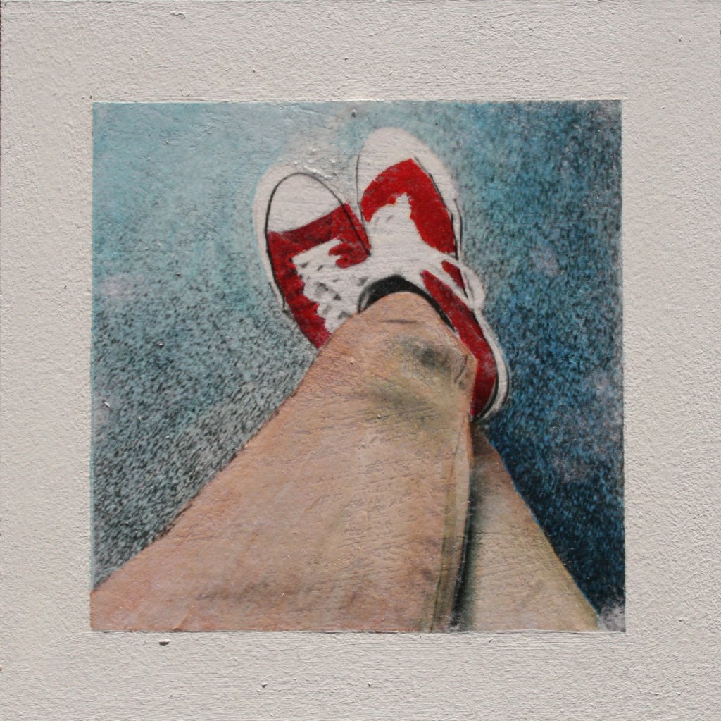 Acrylic and encaustic paint with pigment transfer on board 2016